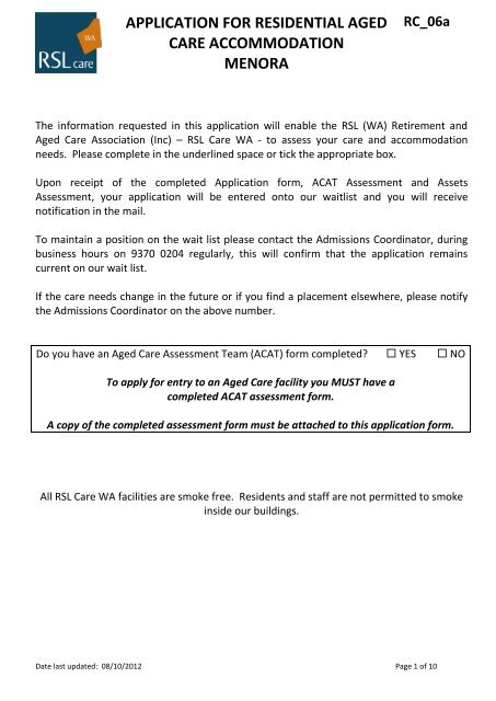 Application For Residential Aged Care Accommodation Rsl Care Wa